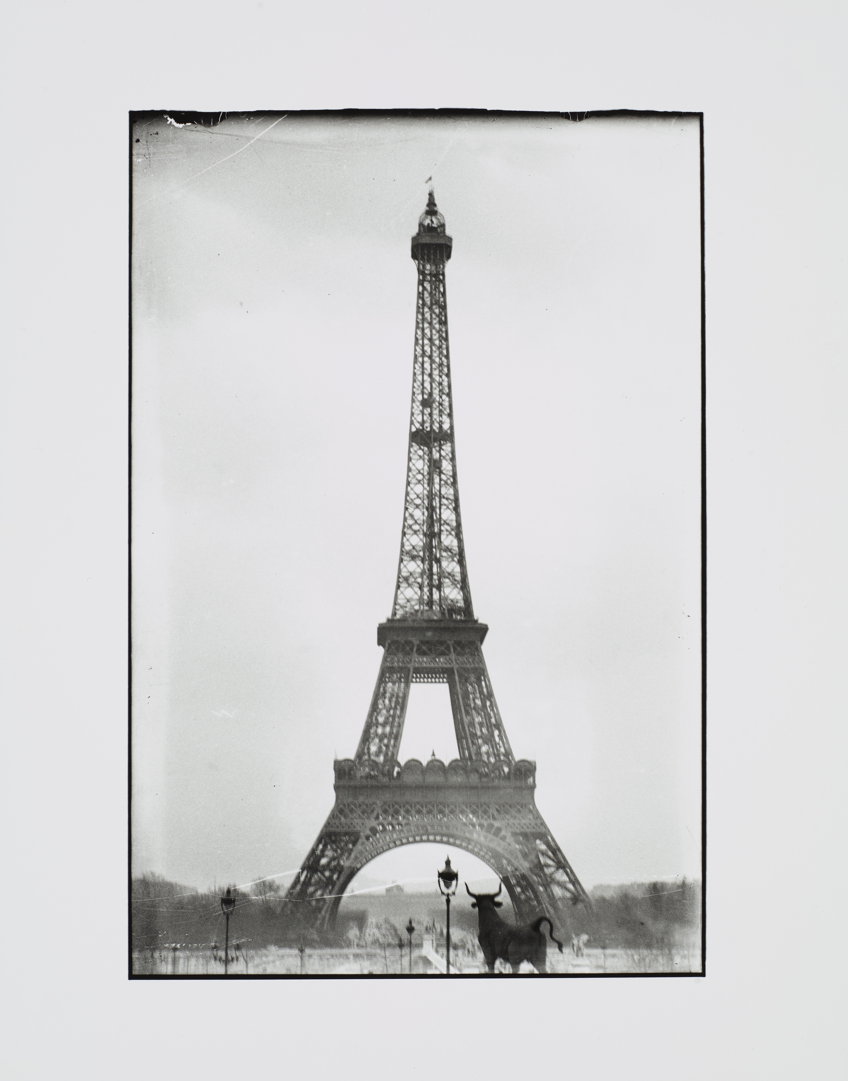Vor einem Seitenflügel des Palais de Trocadéro stehend, hat Krull ihre Kamera auf den 1889 errichteten Eiffelturm gerichtet, und dabei nicht nur die bronzene Stier-Skulptur des Bildhauers Auguste Cain mit erfasst, sondern auch eine der gusseisernen Laternen, die den Weg durch den Jardin de Trocadéro zum Eiffelturm flankierten. Der tiefe Horizont betont die Monumentalität der in den bewölkten Himmel ragenden Ikone der Ingenieurskunst. Wie ein scharfer Spiess sticht die Silhouette der Laterne in den tragenden Bogen des eisernen Aussichtsturmes. Der Stier im Vordergrund nimmt gewissermaßen die Position der Betrachtenden ein.