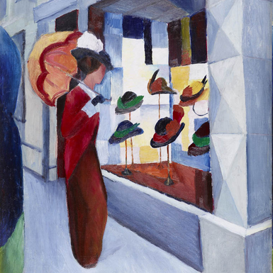 Modes: Frau mit Sonnenschirm vor Hutladen, 1914